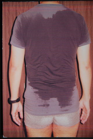 両側の背中・胸・大腿の代償性発汗の軽減・消失が得られました。写真は無負荷のスクワットを40回を1セットとして4セット終了後の発汗状態です。